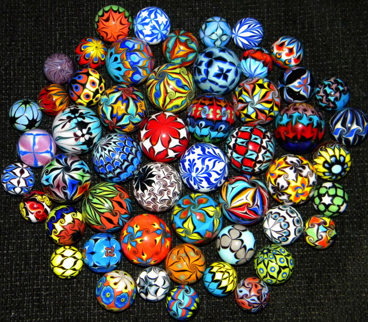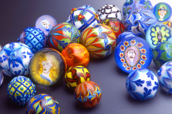 Dinah created many many glass marbles over a period of approximately 18 years. Her marble work is now a part of numerous marble collections but occasionally we see one pop up for sale on eBay or on Facebook. Dinah taught her marble making techniques at the Penland School (NC), at UrbanGlass (NY) and other places and she has demo'ed and lectured widely on both marbles and murrine. |