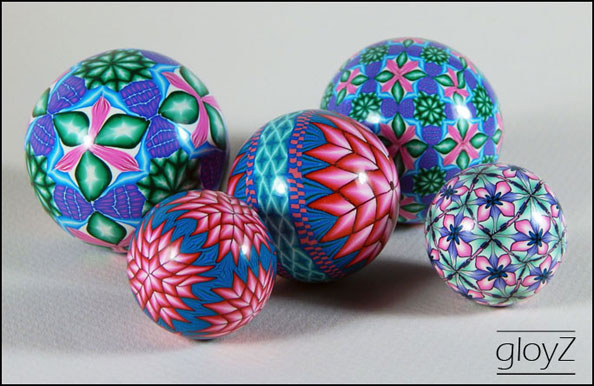 Dinah is back to making murrine marbles again after many, many years. These are somewhat different from her usual creations. They are made by placing thin slices of polymer clay murrine cane on the surface of a handmade glass marble core. She makes these special glass marble cores to have a slight but definite “texture” to the surface which allows her to manipulate the clay cane slices into the intricate patterns. The orbs are then baked in the same kilns that she uses for her glass objects though at a much lower temperature. Once hardened, the marbles are painstakingly hand-sanded, polished and buffed to a beautiful shine.