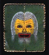 During the 1st century BC-1st century AD in Ptolemaic Egypt there were created extraordinary canes of glass that contained within (running their length) highly detailed figurative imagery in the manner of the murrine (millifiore) canes made today. Among this type of figurative mosaic glass cane work were half-images, which, when two slices were removed from a single cane and laid side by side, formed the representation of what are thought to be grotesque masks used by the actors of ancient Greek and Roman theater. Contemporary with these intricate canes, there were also produced beads with applied face cane slices. More elementary in design and execution than the mask representations, these faces were equally rare and unique.