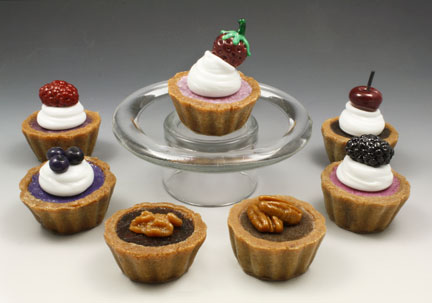 These brand new art glass confections are created using a combination of techniques. The body of the tartlet is made by the process of pate de verre with the application of glass enamels. This results in the realistic 'pie crust' look of the piece with a juicy, fruity interior. The toppings of whipped cream and fruits are added via flamework and/or pate de verre. Each of these terrific treats is the product of several trips through the kilns before they are finally completed. |