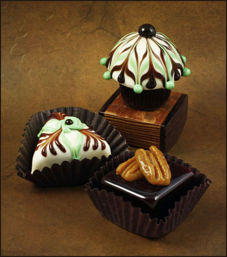Our handcrafted glass chocolates are individually signed and dated and each has a piece of soft felt affixed to the bottom so that there is no worry of scratching a favorite candy dish or elegant display. Each glass chocolate sits in a brown paper candy cup and is individually boxed in a white truffle box if a custom box is not specified. An enclosure card is included in every box.