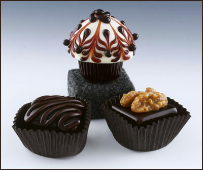Our handcrafted glass chocolates and cupcakes are signed and dated and each has a piece of soft felt affixed to the bottom so that there is no worry of scratching a favorite candy dish or elegant display. Each glass chocolate sits in a brown paper candy cup and, along with the cupcakes, is individually boxed in a white truffle box if a custom box is not specified. An enclosure card is included in every box.
